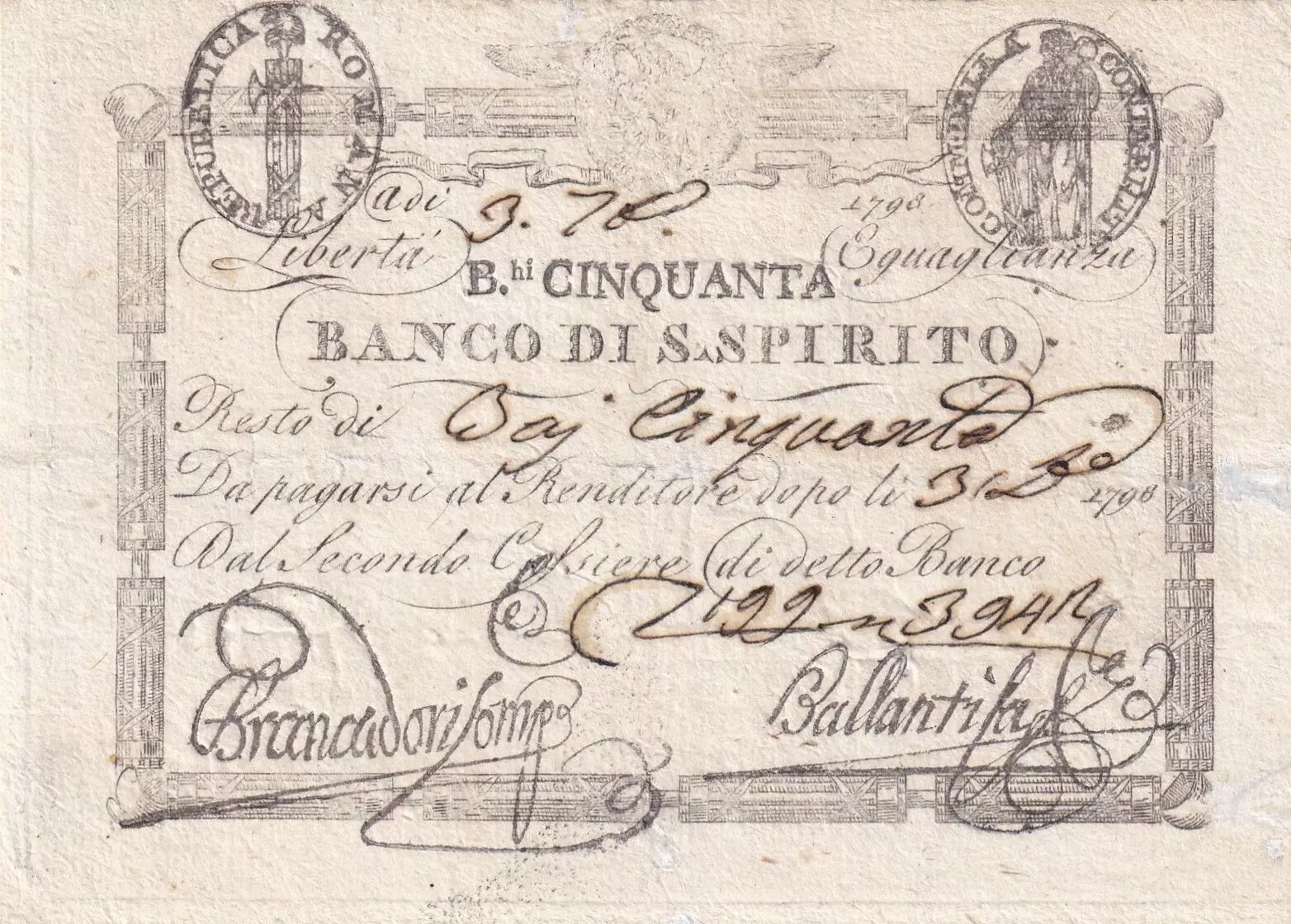 Home > World Banknotes > European Banknotes > Italy - Italian States > Italy 50 Bajocchi Banco di Spirito - 1798