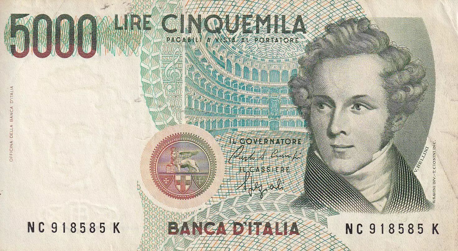 Banknote Italy 5000 Lire - V Bellini - 1985 - Serial NC - P.111b