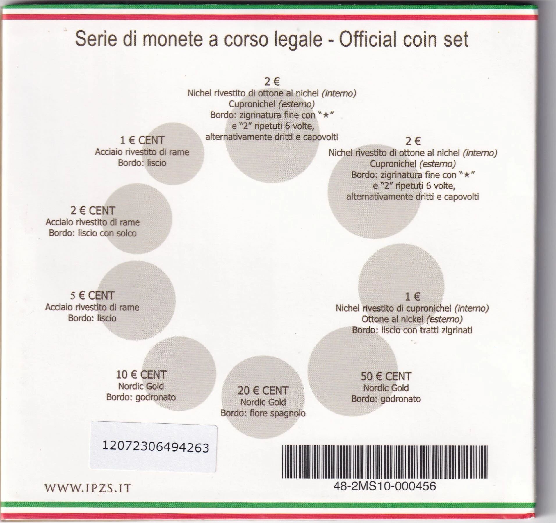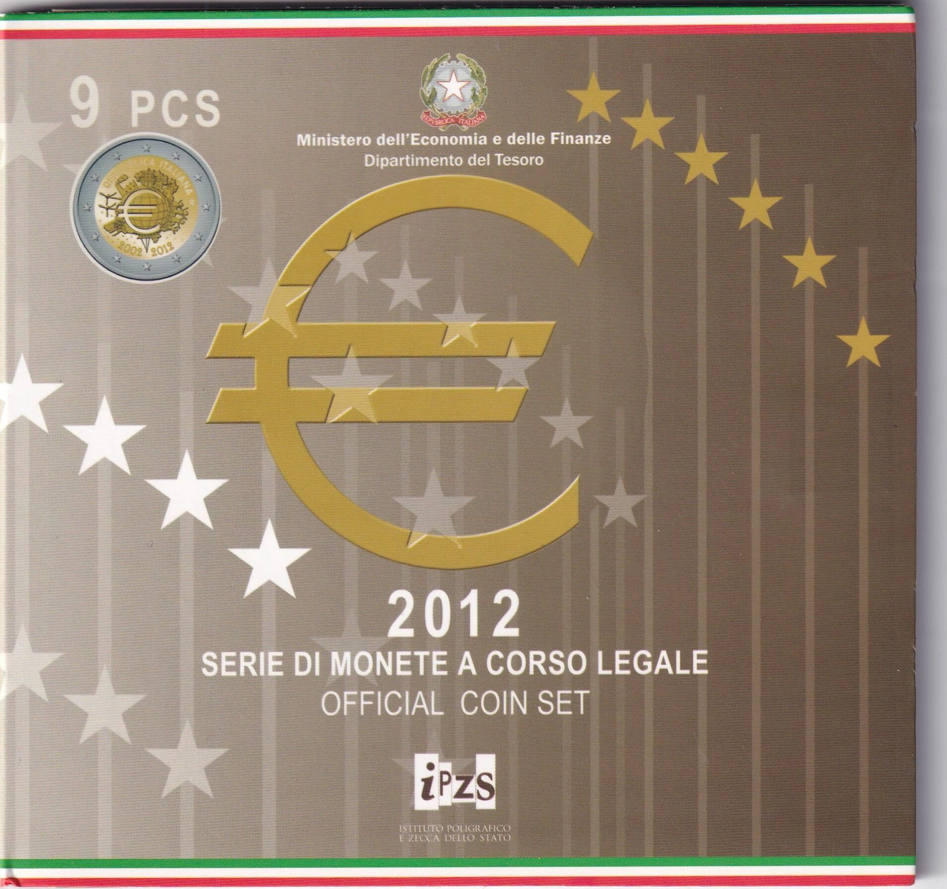 The set also contains the 2 euro commemorative coins issued by Italy in 2012. These 2 euro commemorative coins feature specific designs related to particular events or anniversaries. Their designs differ from those of the standard 2 euro coin.