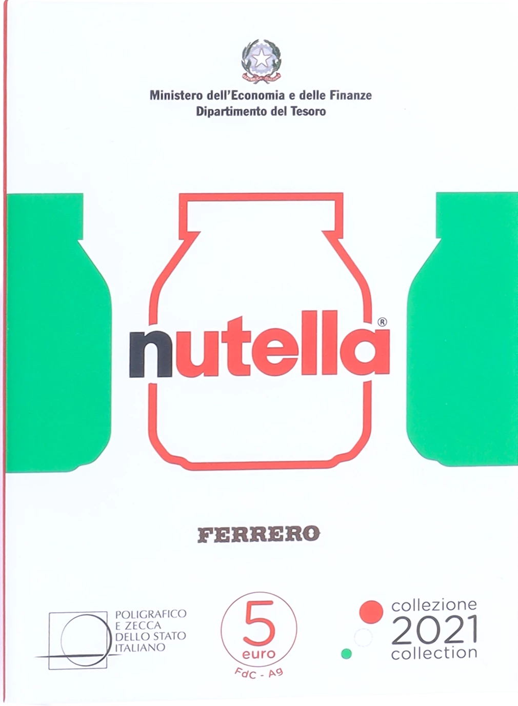 To illustrate these pieces, IPZS uses the traditional jar containing the spread. The difference between each version is the colouring of the lid of the jar. The colours (green, white and red) are those of the Italian flag. On the reverse side, behind the ?5 face value, is the entrance to the historic Ferrero factory in Alba. Each version is produced in a mintage of 15,000 pieces, 10,000 in individual blister packs and 5,000 in a box. Each piece is made of 925 silver ? and has a weight of 18 g. with a diameter of 32 millimetres.