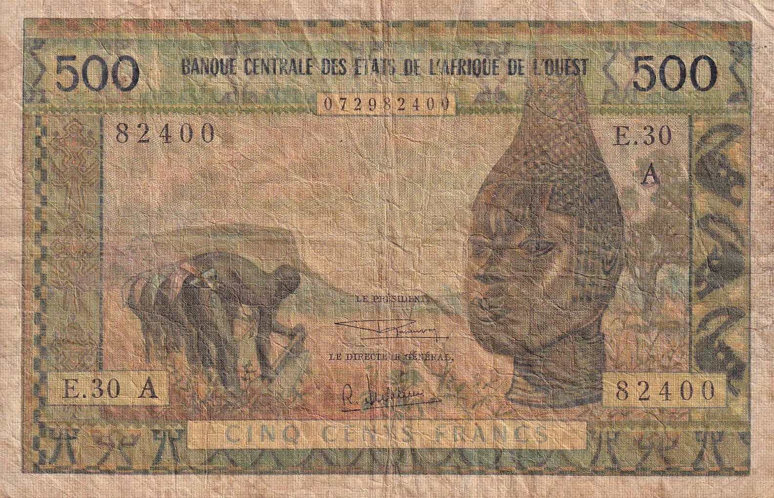 Home > > Ivory Coast 500 Francs - Farmers - ND (1959-1964) - A (Ivory Coast) - Serial E.30 - F - P.102Af