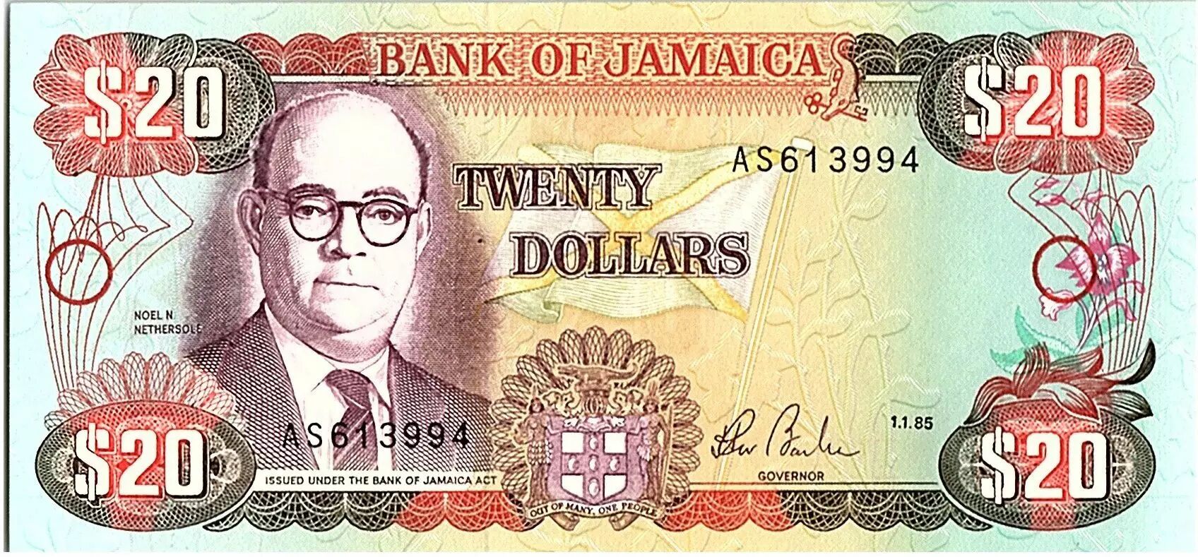 Billet Jamaïque 20 Dollars, Noel Nethersolle - Banque - 1985