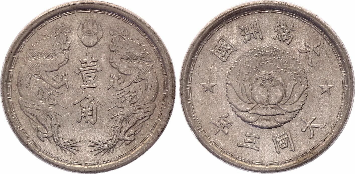 The reverse of the coin depicts two facing dragons, between which the face value is inscribed. A pearl is visible above this representation. The coin was issued by Manchukuo, a Japanese puppet state in China, during the reign of Emperor Puyi. It is one of the common coins of that era, issued during years 2 and 3 of the Chinese Datong calendar (1933-1934). Its value is 10 fen, equivalent to 0.1 jiao. The currency used was the Yuan, in use from 1934 to 1945. The coin is round in shape.