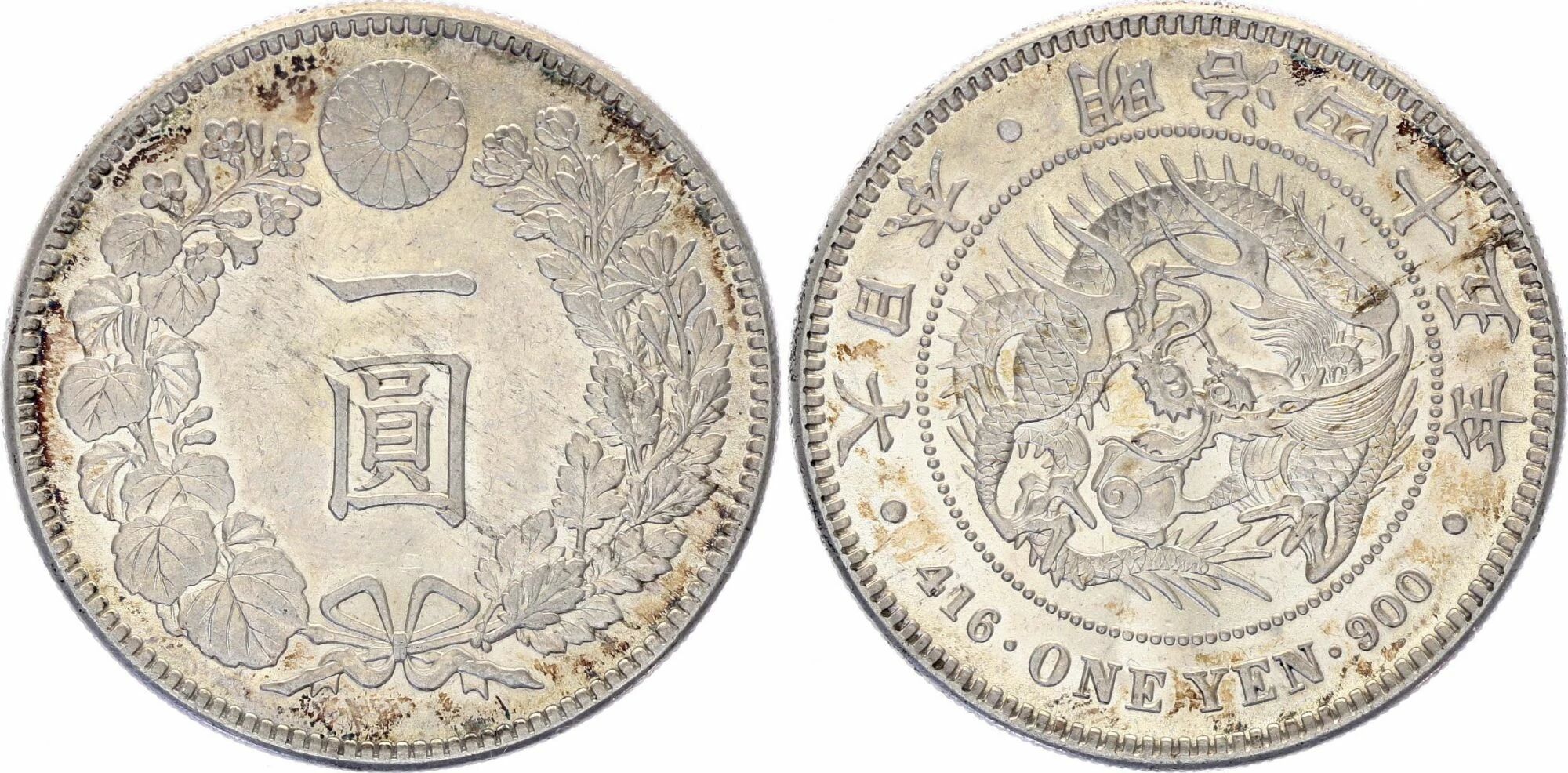 This coin is a silver 1 Yen, minted during the Meiji era, specifically in the year 45, corresponding to the year 1912. It was issued by Japan under the reign of Emperor Meiji.