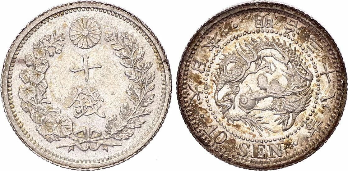 The coin is made of silver with a fineness of 800?. It weighs 2.70 grams and has a diameter of 17.6 millimeters. Its thickness is 1.2 millimeters and its shape is round. The face value of the coin is 10 sen, which is equivalent to 0.10 yen. The yen has been the currency used in Japan since 1871.