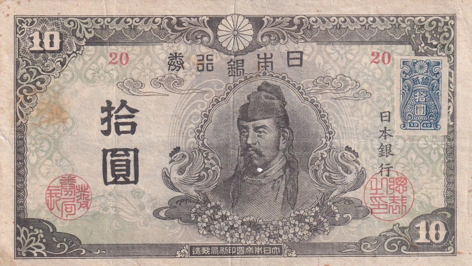 This 10 yen banknote, with the depiction of Wakeno Kiyomaro and the affixed stamp, bears witness to a specific period in Japanese monetary history. The presence of a block of 20 adds particular interest for collectors or those interested in the financial history of Japan.