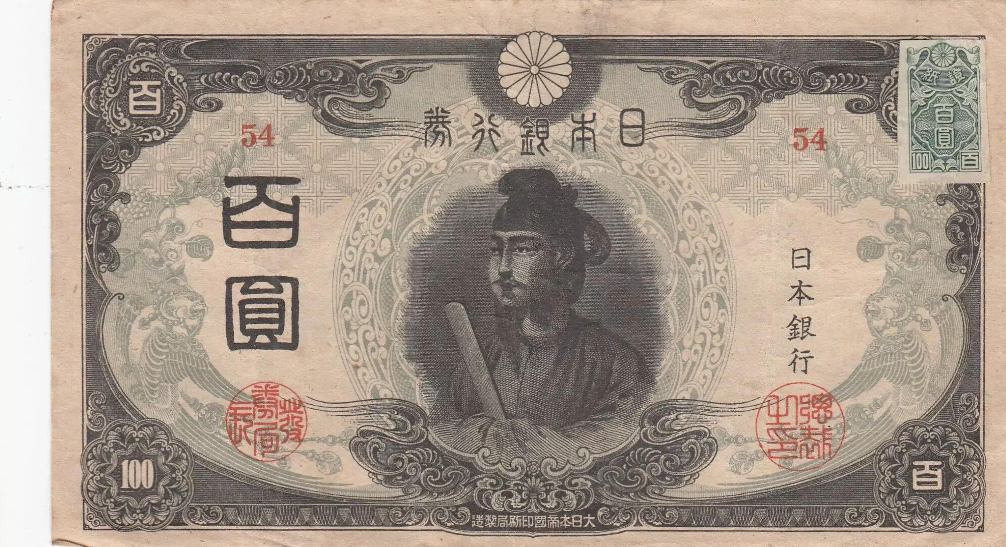 The stamps on certain Japanese banknotes from 1945 were used to control monetary exchanges and prevent counterfeiting. Towards the end of World War II, Japan faced a shortage of materials to produce new banknotes. To address this situation, fiscal stamps were used as a temporary measure.