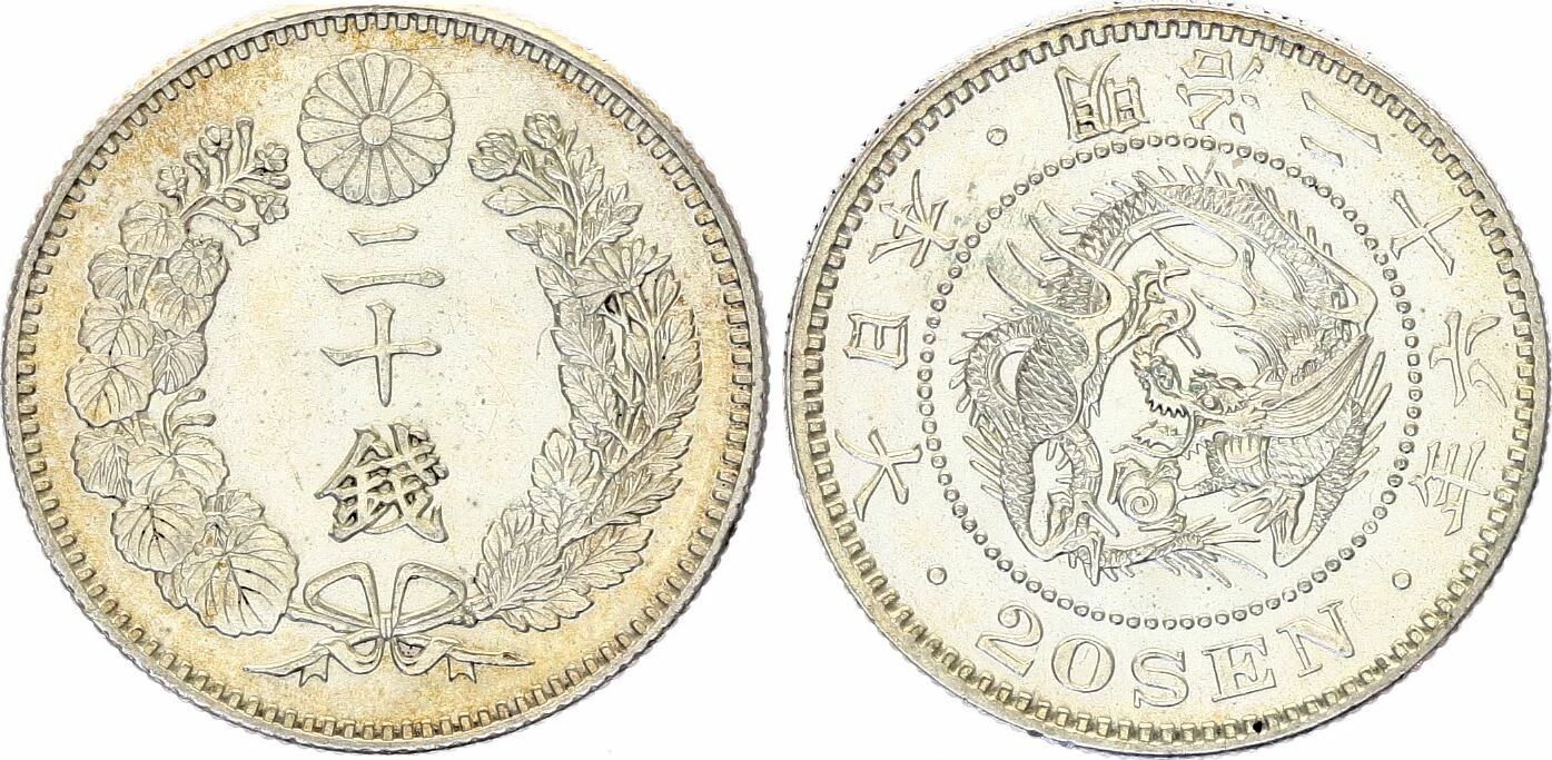 This common type coin was issued by Japan during the Meiji era, under the reign of the emperor of the same name (1867-1912). Its face value is 20 sen, a fraction of the yen, the currency in use since 1871.