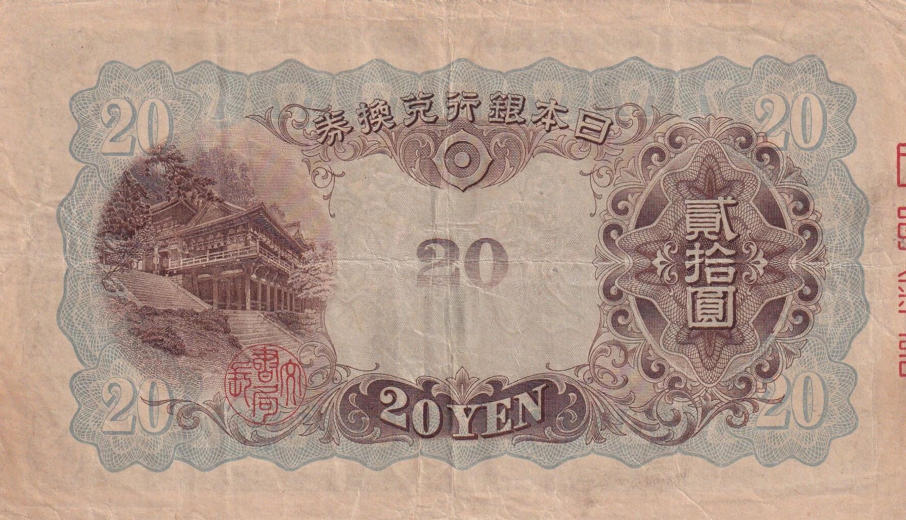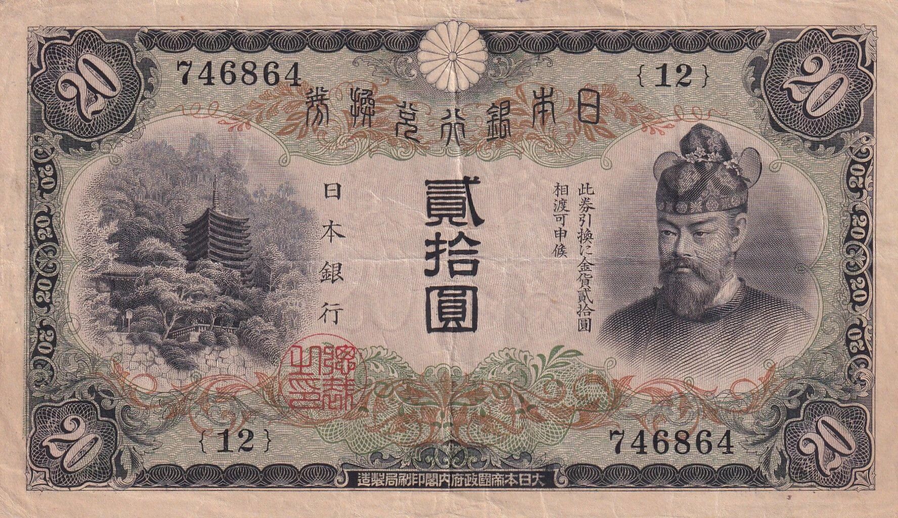 This Japanese banknote was issued in 1931. It has a face value of 20 yen.
