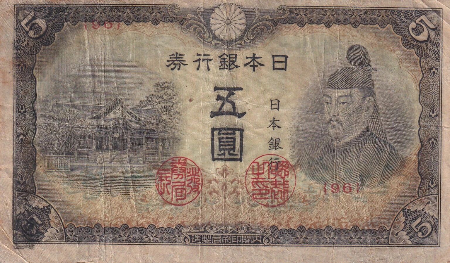 The banknote depicts Sugawara Michizane, a learned and revered Japanese historical figure, whose image is incorporated into the design. The face value of the banknote is 5 yen. Its weight is approximately 1 gram.