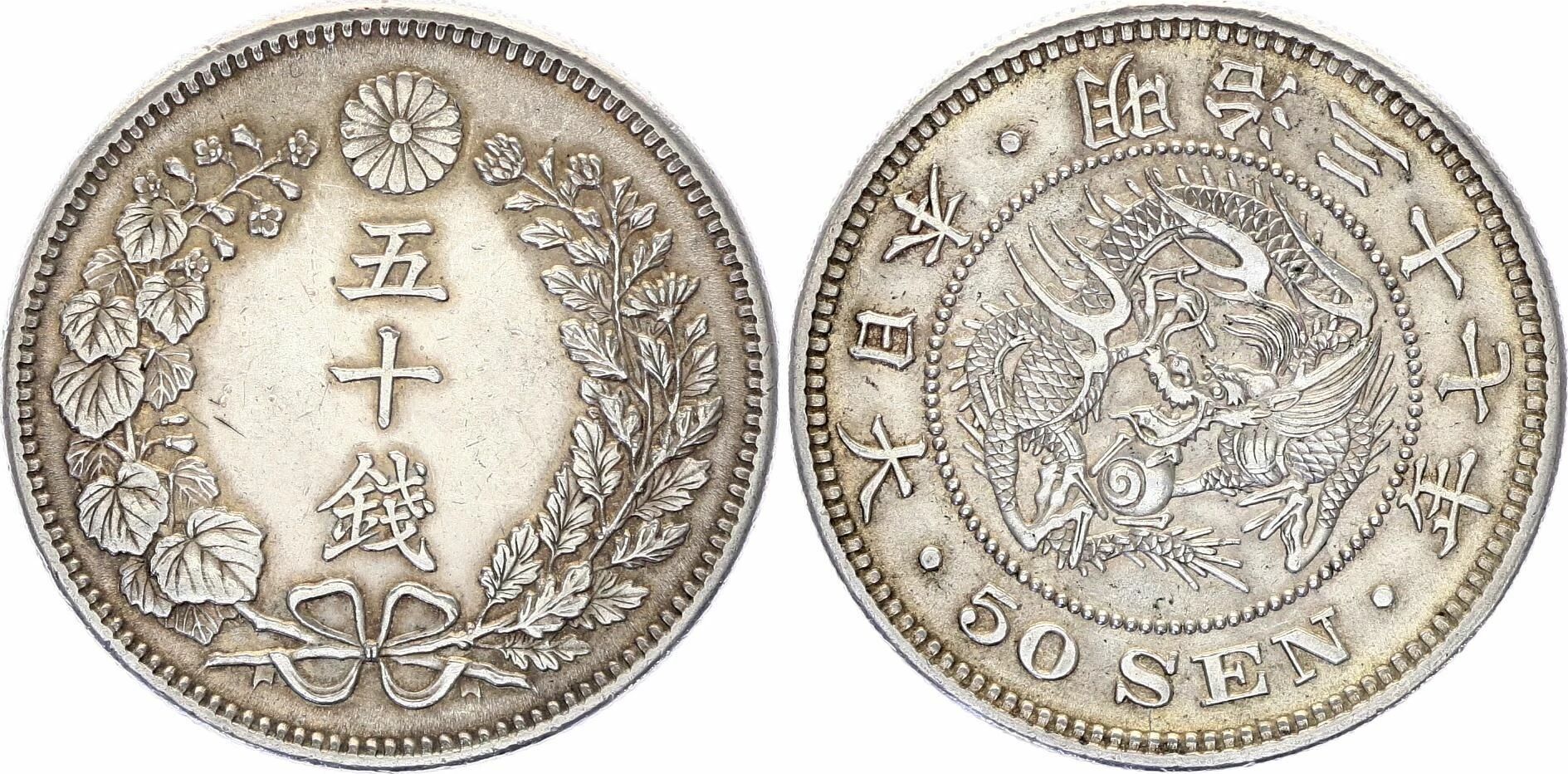 Struck in silver with a fineness of 800 ?, the coin has a diameter of approximately 30.5 millimeters and a weight of 13.48 grams, making it an important intermediate currency in the daily circulation of the time. Its iconography is particularly remarkable: the obverse features a majestic imperial dragon surrounded by inscriptions indicating the name of the country, Dai Nippon ('Great Japan'), while the face value '50 SEN' appears in Latin characters, a clear sign of Japan's international openness during this period. The reverse, for its part, highlights the denomination in Japanese characters, framed by a vegetal crown symbolizing prosperity and harmony.