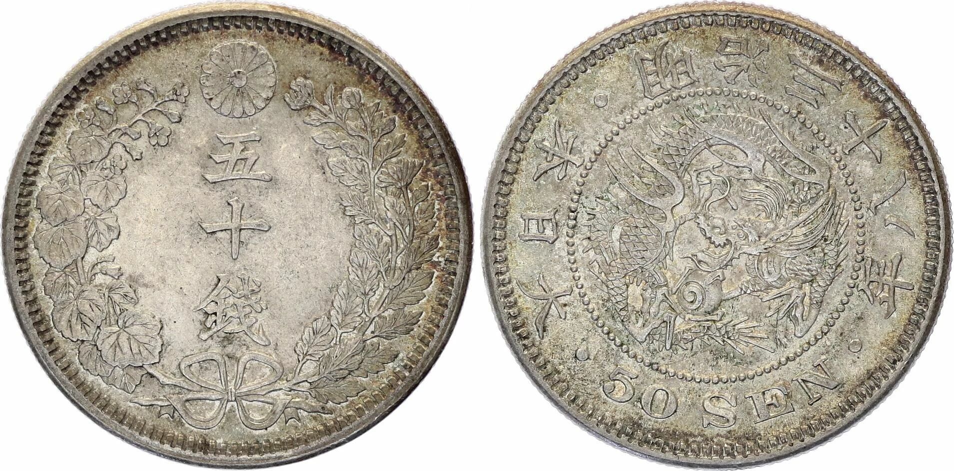 The 50 sen coin, struck in 900 ? silver, dates from the 38th year of Meiji, or 1905. It weighs 13.48 grams and its diameter measures 30.5 millimeters. The mintage of this coin is 9,566,100 copies.