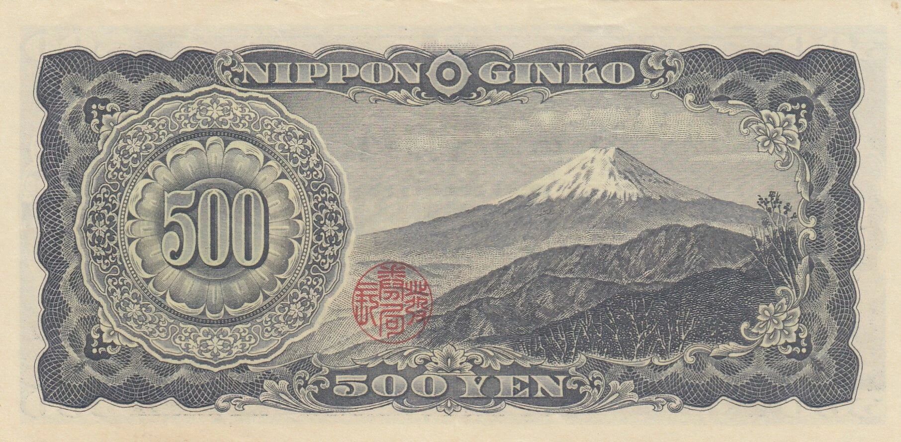 This 500 Yen banknote is a testament to Japanese history, honoring a key political figure and a natural symbol of the country. Its detailed design and cultural references make it a notable collector's item.