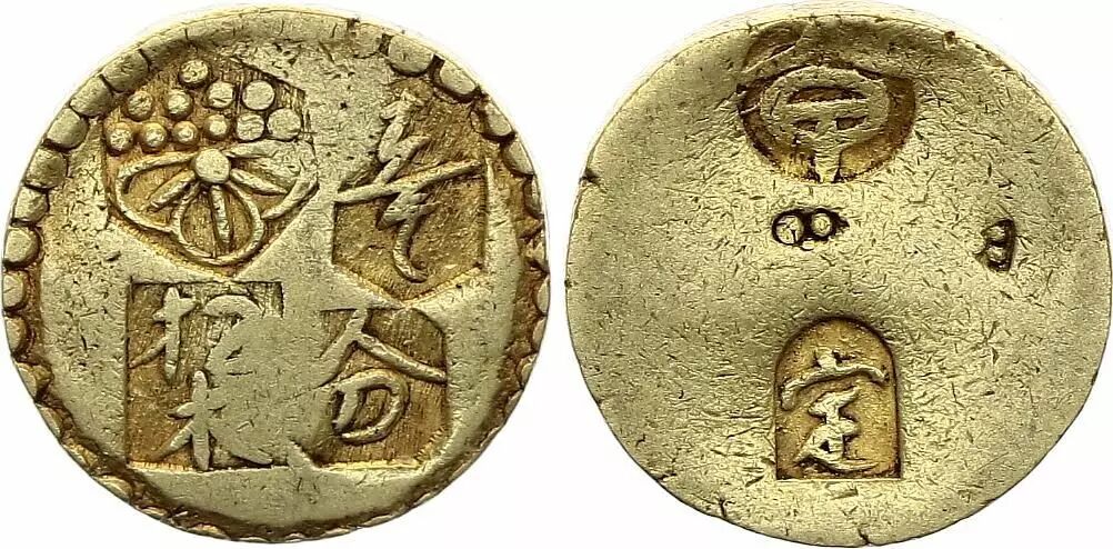 Rare provincial gold coin from feudal Japan, issued in the Koshu region, which was operating gold mines at the time. It is an official government gold coin with a value of 1 bu.