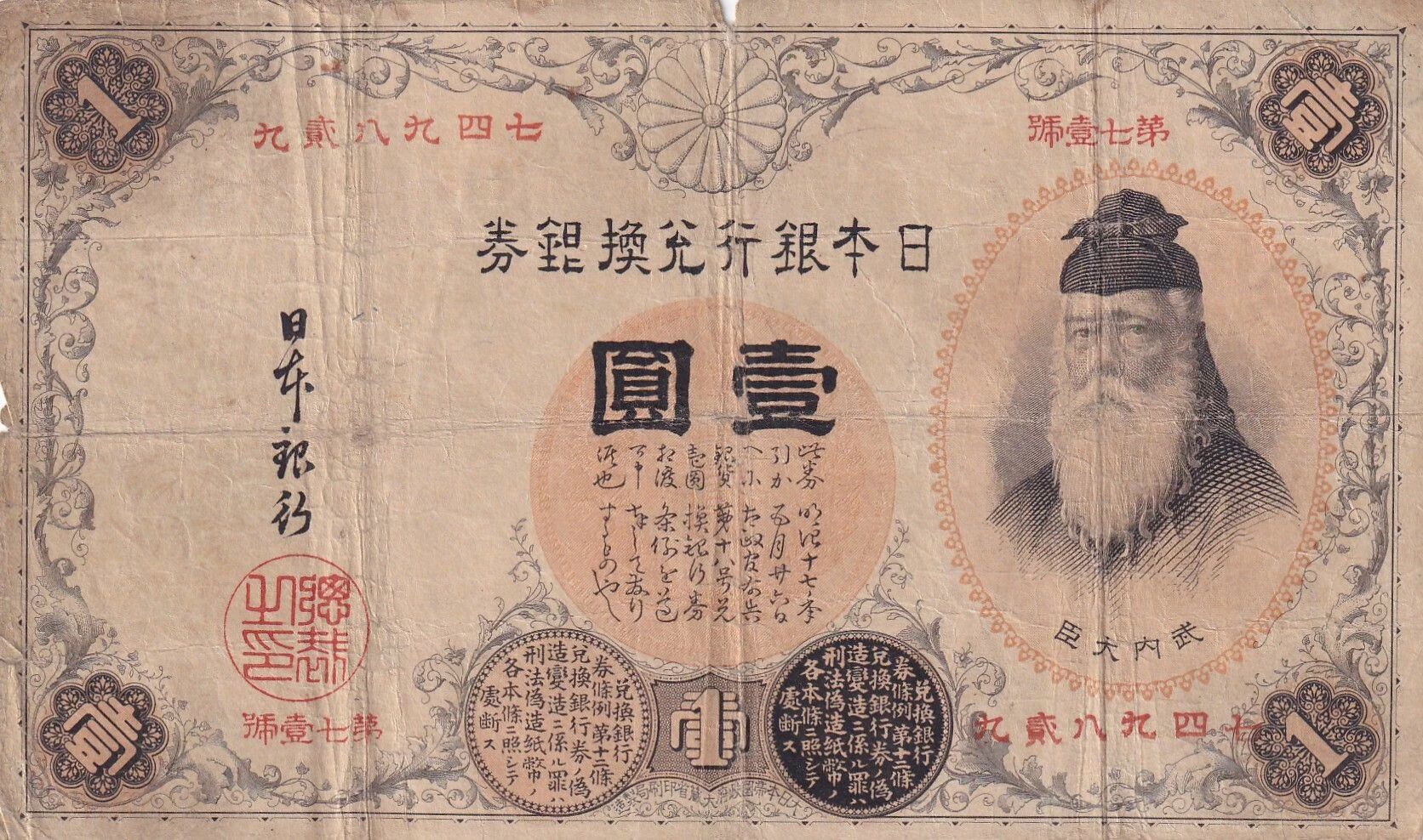 Ce billet de 1 yen est un témoignage de l'histoire monétaire du Japon et offre un aperçu des figures emblématiques et des symboles culturels qui étaient importants à la fin du XIXe siècle.
