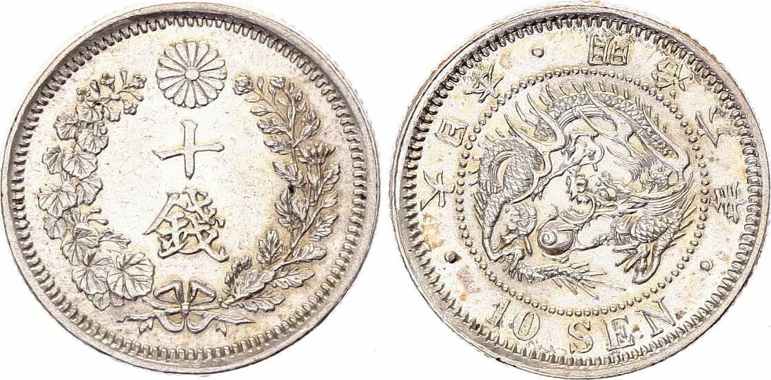 Cette pièce de monnaie, d'une valeur nominale de 10 sen, a été frappée au Japon sous le règne de l'empereur Meiji (1867-1912). Elle fait partie des pièces courantes émises entre les années 6 et 39 du calendrier Meiji, correspondant aux années 1873 à 1906 du calendrier grégorien.