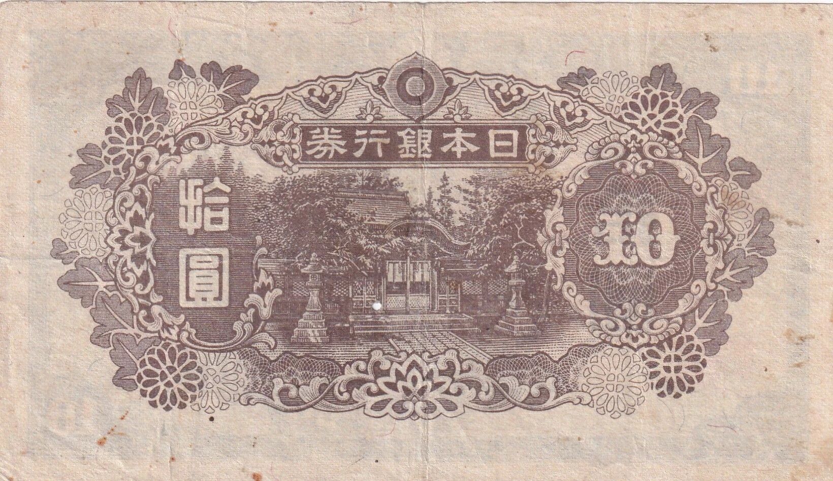 Ce produit est un billet de banque d'une valeur nominale de 10 yens, émis par le Japon en 1945. Il s'agit d'un bloc de 20 billets, ce qui signifie qu'il est composé de vingt unités individuelles de ce billet, potentiellement non séparées.
