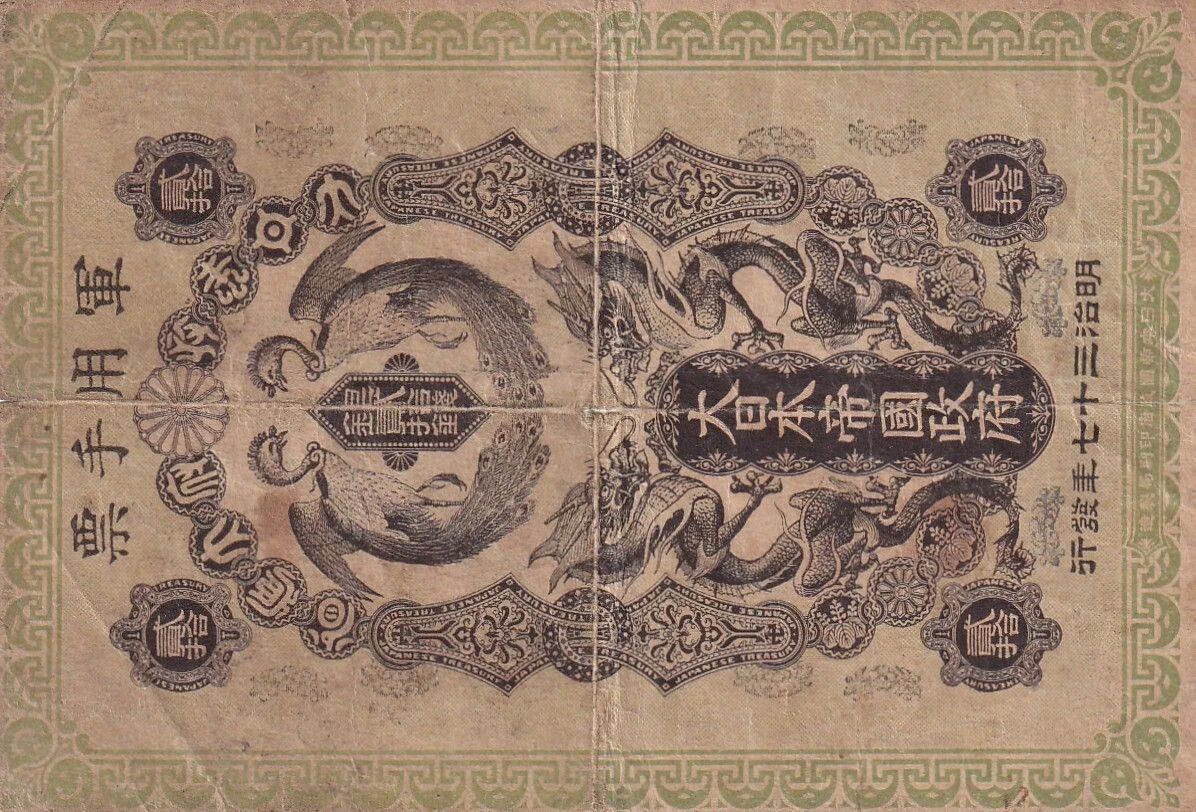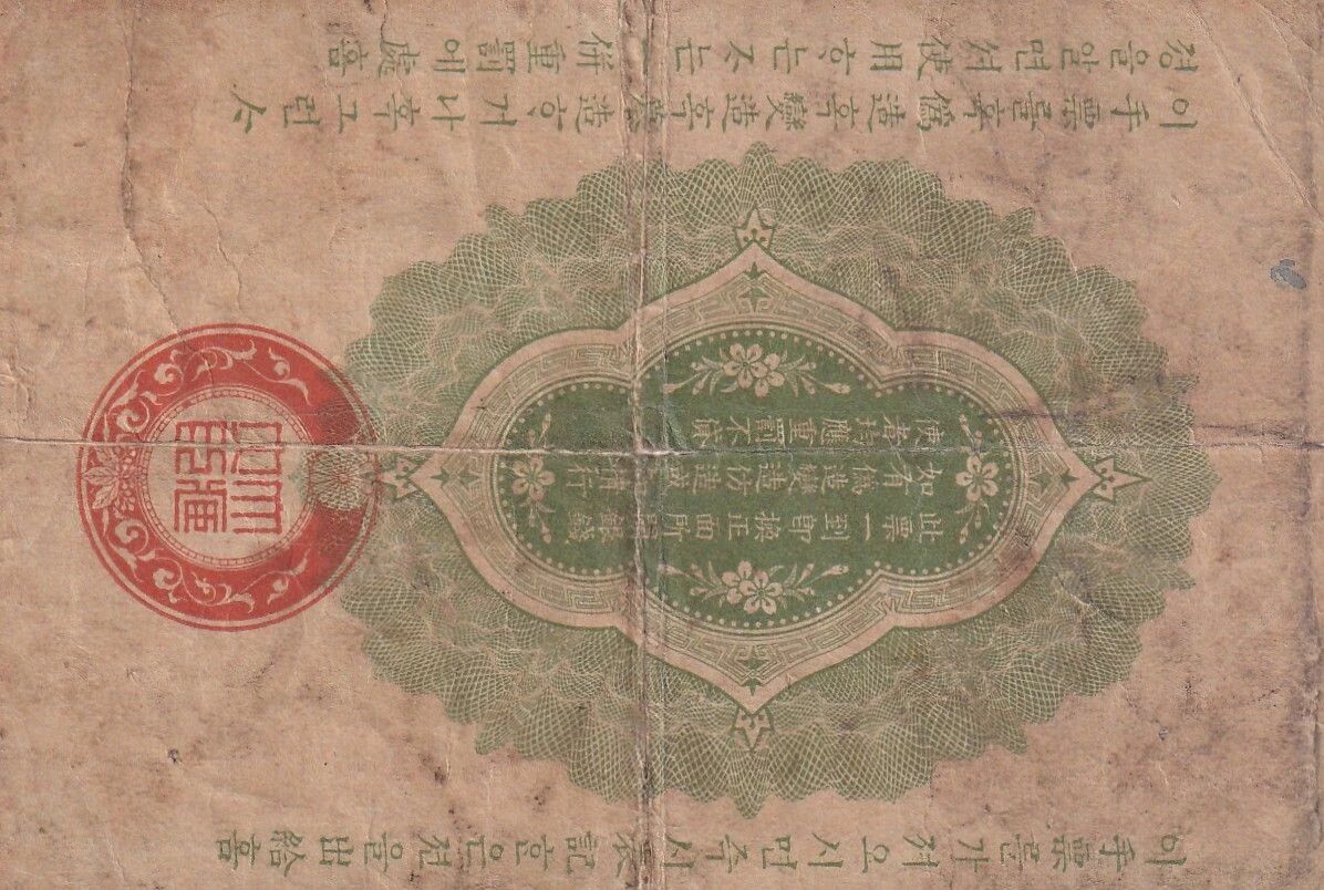 Le verso du billet reprend des éléments graphiques présents sur le recto, assurant une cohérence visuelle. Des motifs ornementaux complexes continuent d'orner le billet, avec une attention particulière portée aux détails pour prévenir la contrefaçon. La valeur nominale est également répétée au verso. Les inscriptions sont en japonais, avec des caractères calligraphiés qui ajoutent une dimension artistique et traditionnelle. L'année d'émission, Meiji 37 (1904), est également inscrite.