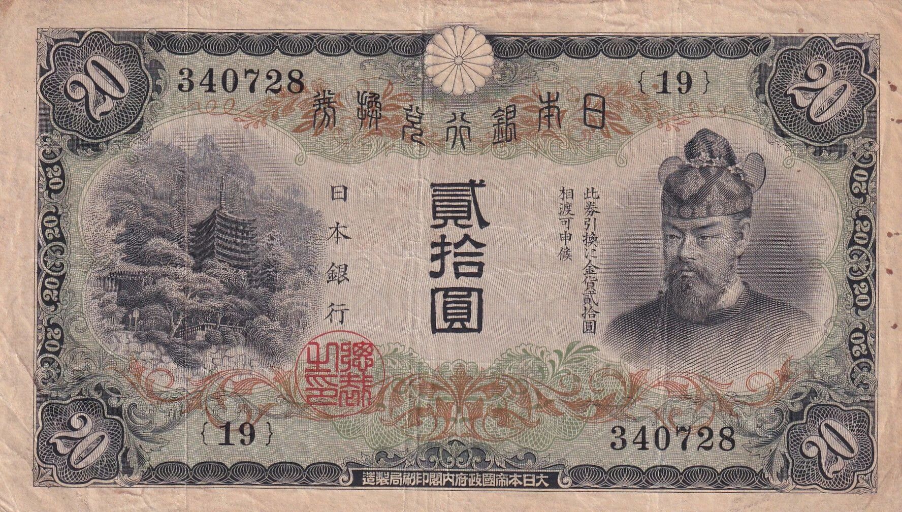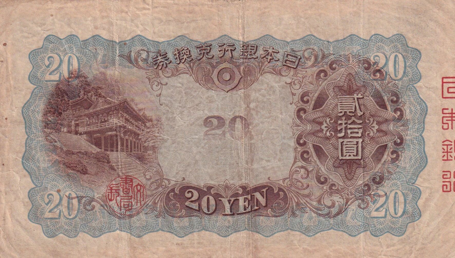 Ce billet de banque est émis par le Japon et présente une valeur nominale de 20 yens. Il date de l'année 1931 et fait partie du Bloc 19.
