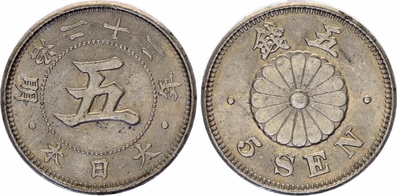 Il s'agit d'une pièce de monnaie de 5 sen, émise par le Japon sous le règne de l'empereur Meiji. Cette pièce est datée de l'an 23 de l'ère Meiji, correspondant à l'année 1890 du calendrier grégorien.