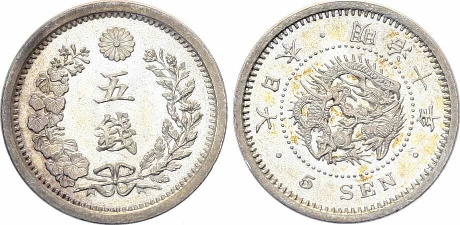 Dans ce contexte apparaissent les pièces de 5 sen, petites monnaies d?argent destinées aux transactions courantes, mais aujourd?hui particulièrement recherchées pour leur qualité artistique et leur importance historique.