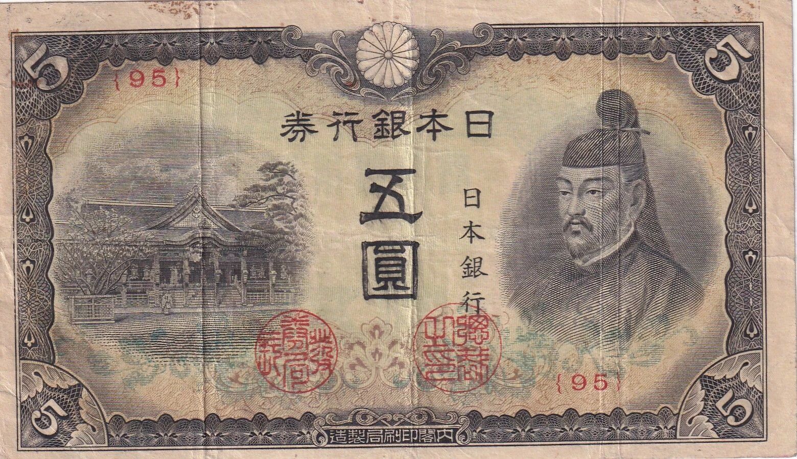 Le billet fait partie du bloc 95, ce qui pourrait indiquer une série ou une édition spécifique au sein de l'émission globale de ces billets de cinq yens. Ce billet témoigne du contexte historique et culturel du Japon durant la période de son émission, reflétant les figures emblématiques et les traditions artistiques du pays.