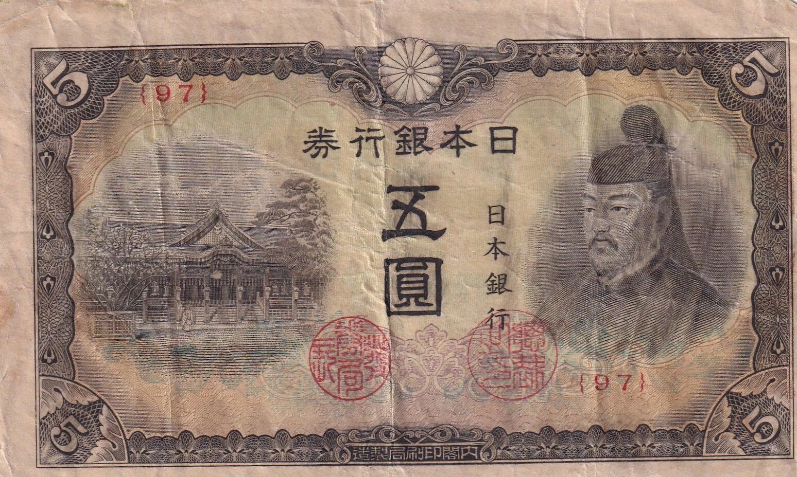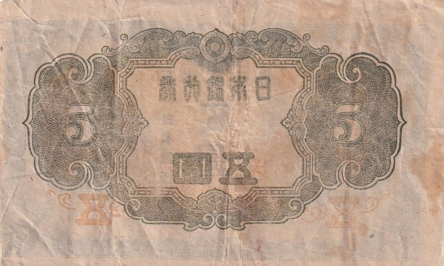 Ce billet de banque japonais a été émis en 1944. Il représente une valeur nominale de 5 yens. Ce billet appartient à la catégorie des blocs numérotés 97.