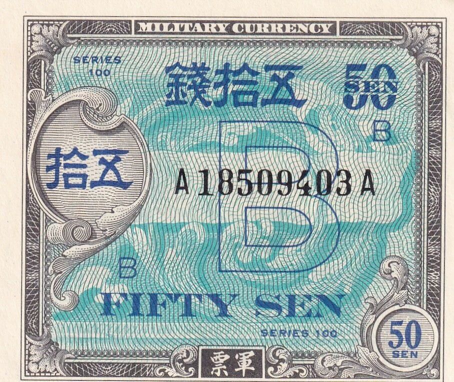 La valeur nominale de 50 sen indique sa valeur d'échange par rapport à d'autres coupures de la même devise. Les billets de la Monnaie Militaire Alliée sont aujourd'hui des objets de collection recherchés pour leur importance historique et leur rôle durant la période de l'après-guerre.