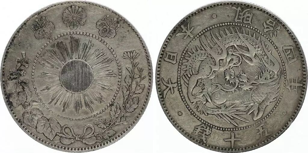 Accueil > Monnaies du monde > Monnaies d'Asie > Japon > Japon 50 Sen Dragon - 1871 Meiji 4 - 2 em ex