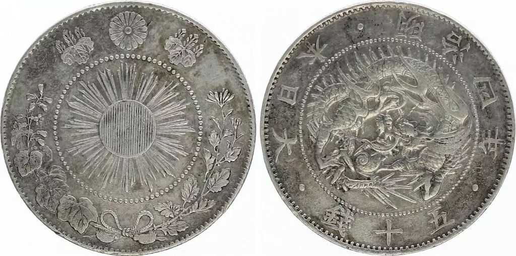 Accueil > Monnaies du monde > Monnaies d'Asie > Japon > Japon 50 Sen Dragon - 1871 Meiji 4 - 4 em ex