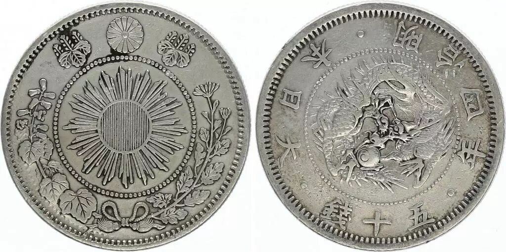 Accueil > Monnaies du monde > Monnaies d'Asie > Japon > Japon 50 Sen Dragon (Petit) - 1871 Meiji 4 - 2 em ex