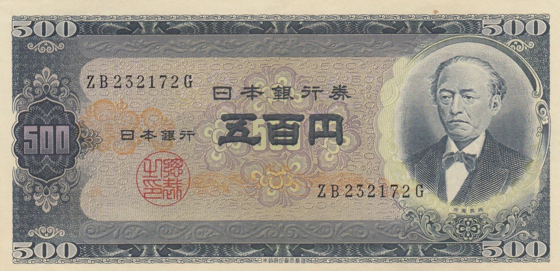Ce billet de banque de 500 yens du Japon, classé dans la série ZB, a été émis entre 1951 et 1971. Il s'agit d'un billet commémoratif rendant hommage à Tomomi Iwakura et au Mont Fuji.