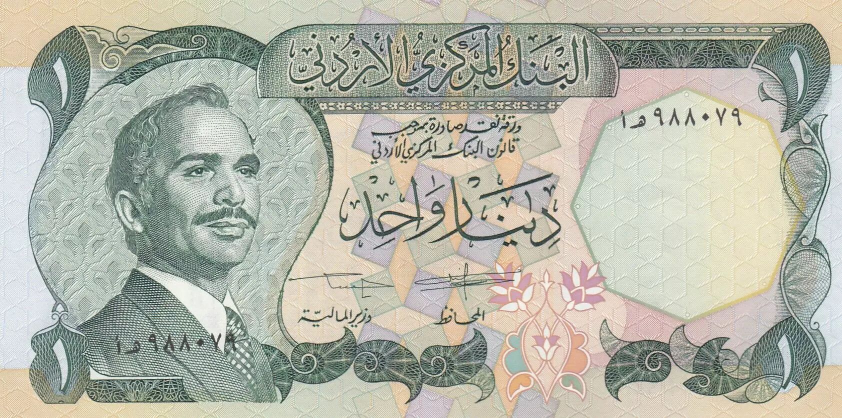 This banknote was issued by Jordan. It has a face value of 1 dinar. This banknote was issued between 1975 and 1992.