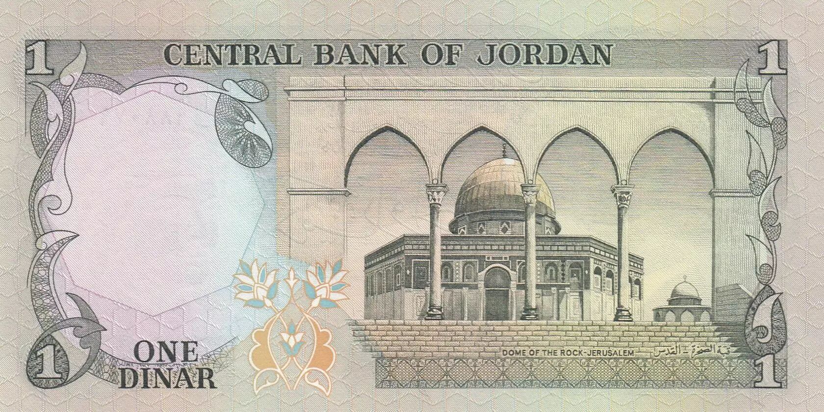 On the back, the banknote depicts the Dome of the Rock in Jerusalem, an iconic Islamic shrine. The Dome of the Rock is an important holy site for Muslims, located on the Temple Mount in Jerusalem.
