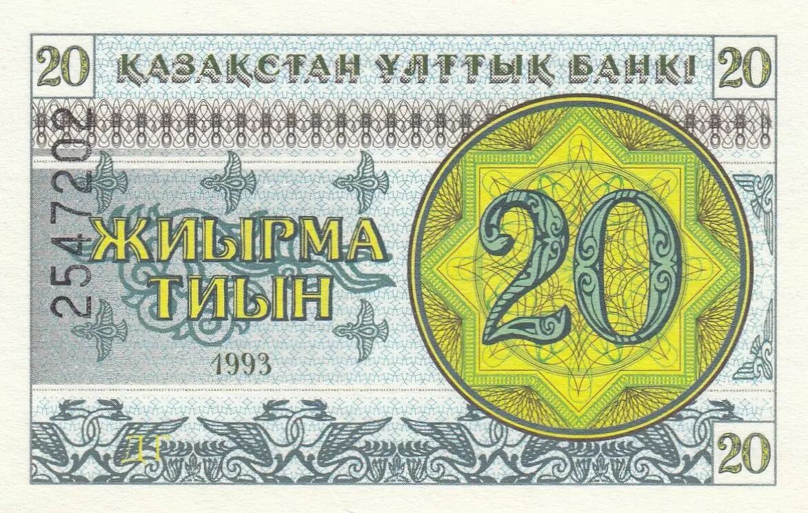 The 20 Tyin banknote, issued in 1993 by Kazakhstan, is an example of the first series of banknotes introduced after the country's independence. This banknote has distinctive features on both sides.