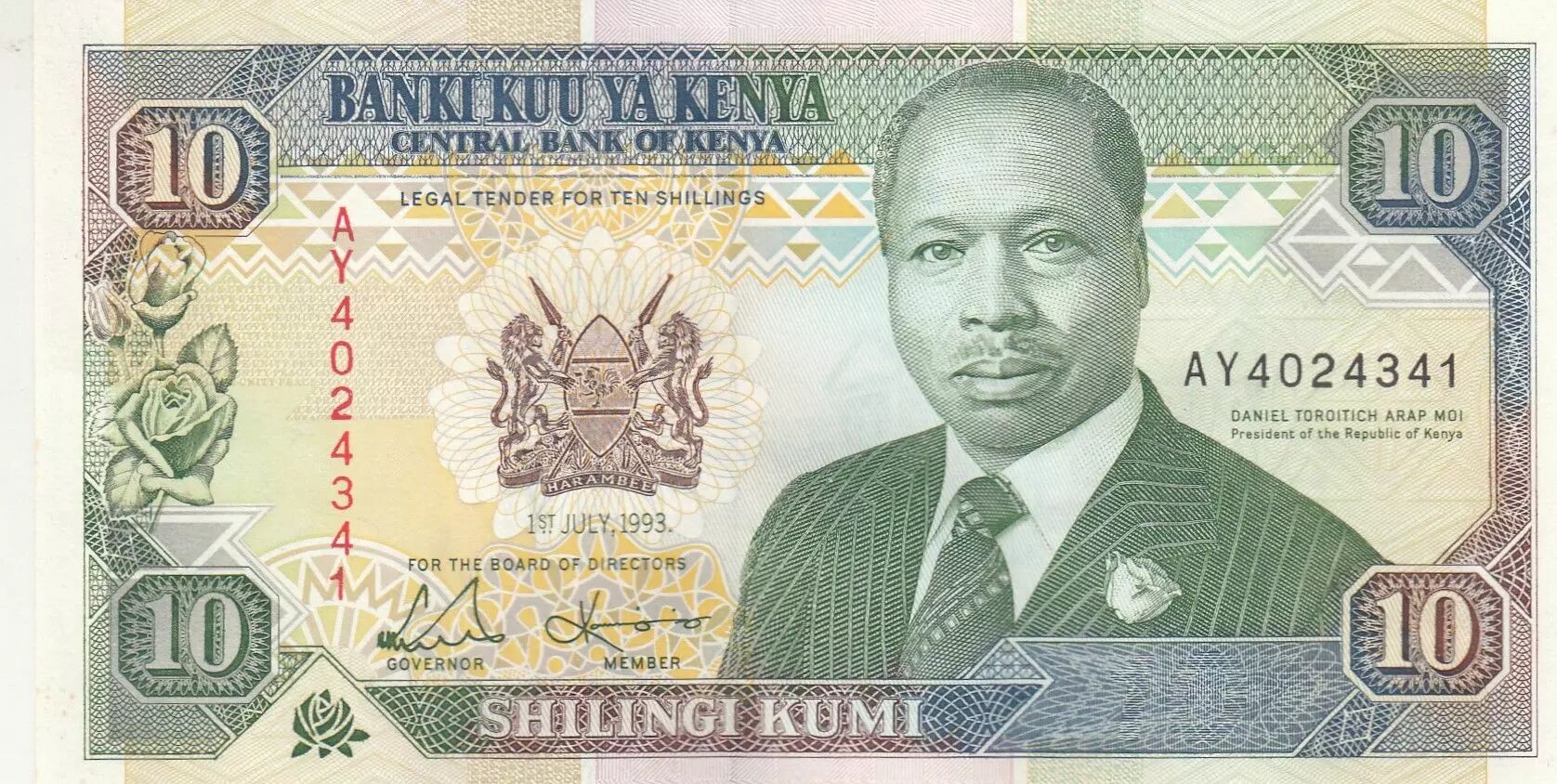 Ce billet de banque, d'une valeur nominale de 10 shillings, a été émis par le Kenya en date du 1er juillet 1993 et appartient à la série AY. Il s'agit d'une représentation fiduciaire de la nation kényane à cette période.