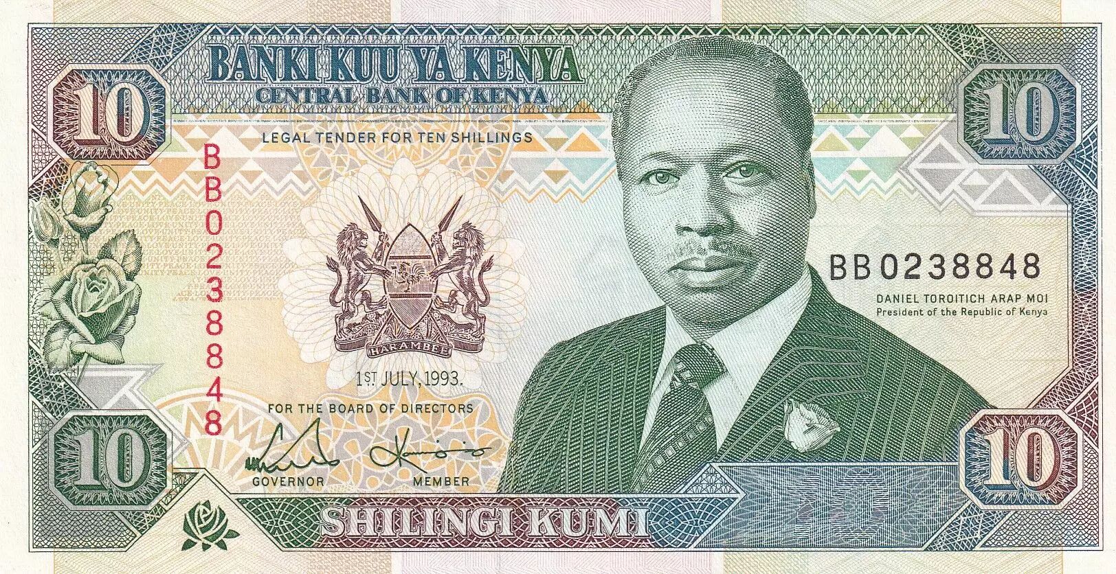 Banknote Kenya 10 Shillings - Kenyatta - Arms - 1993 - Serial BB - P.24e