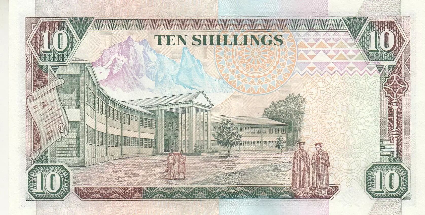 On the back, the banknote depicts Kabarnet High School, located in the Baringo district in the Rift Valley. This university building is accompanied by a diploma, symbolizing the importance of education. The face value, "TEN SHILLINGS", is repeated in words. The inscriptions are written in Latin script.