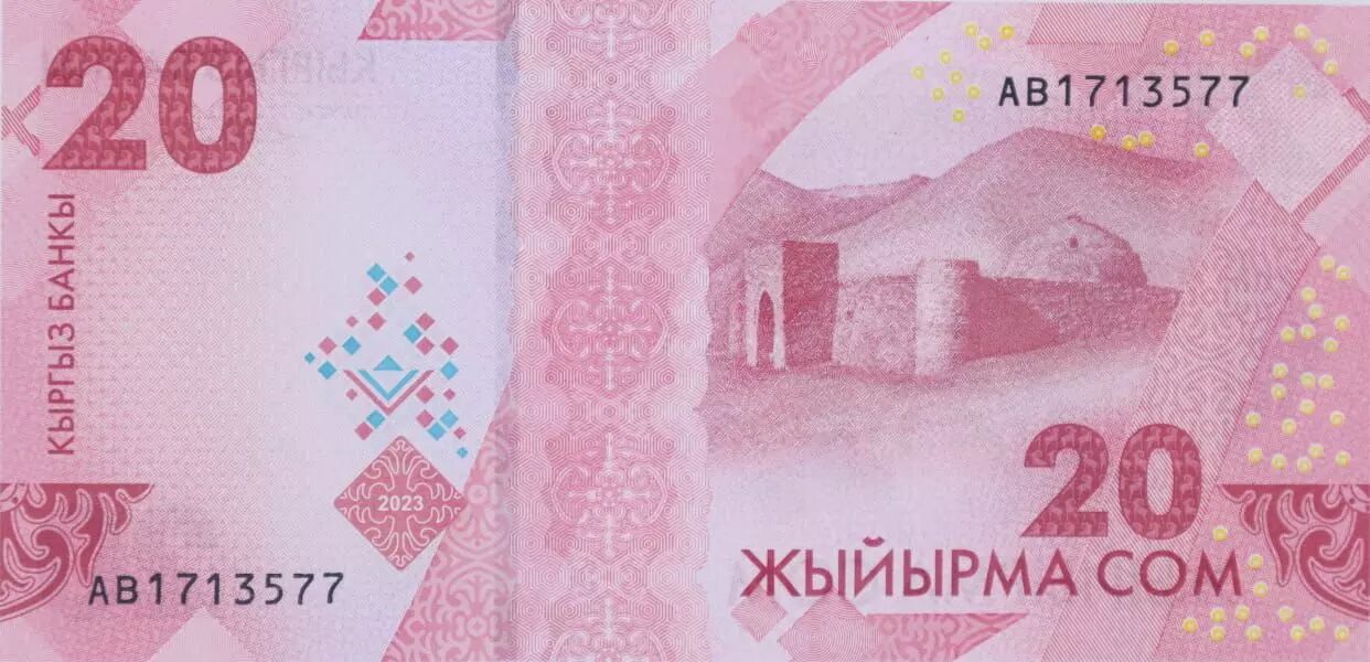 Ce billet de banque est émis par le Kirghizistan et possède une valeur nominale de 20 soms. Il date de l'année 2023 et appartient à la série AB.