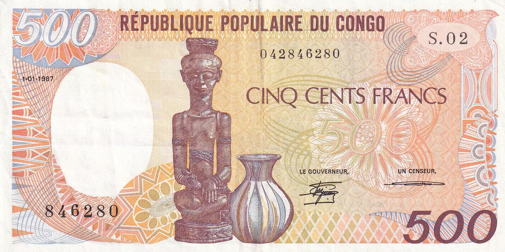 Banknote Kongo 500 Francs - Carving and jug - 1987 - Sérial S.02 - P.8a