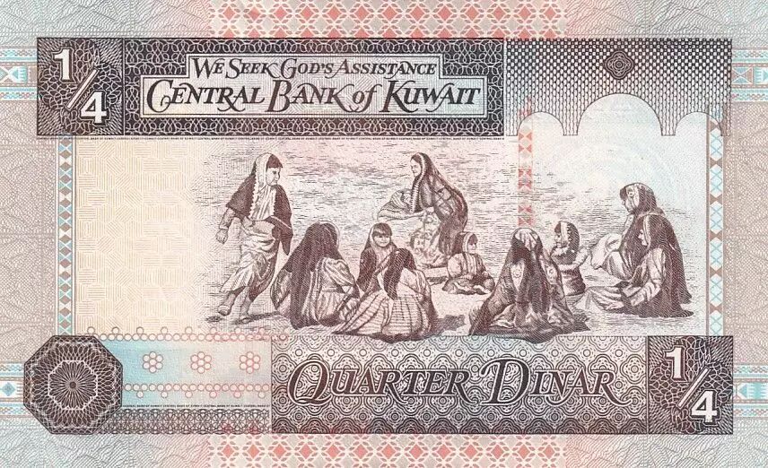 The reverse of the note features a color palette of brown and grayish purple on a multicolored background. It depicts young girls playing a traditional game called "throwing the handkerchief". It also includes the inscription "We Seek God's Assistance", as well as the mentions "Central Bank of Kuwait" and "Quarter Dinar".