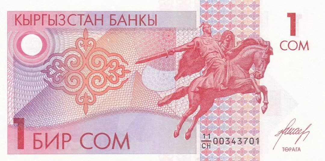 This banknote, with a face value of 1 som, was issued in 1993 by Kyrgyzstan. It measures 139 mm long and 70 mm wide.