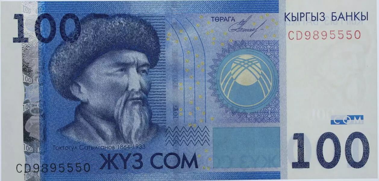 On the front of the banknote, there is a portrait or symbolic representation related to Toktogul or Mount Teniyri. Inscriptions in Kyrgyz, as well as the face value of the banknote, are also featured. On the back, the main theme is often a scene illustrating the culture, history, or nature of Kyrgyzstan. Graphic elements and ornamental motifs complement the overall aesthetic of the banknote.