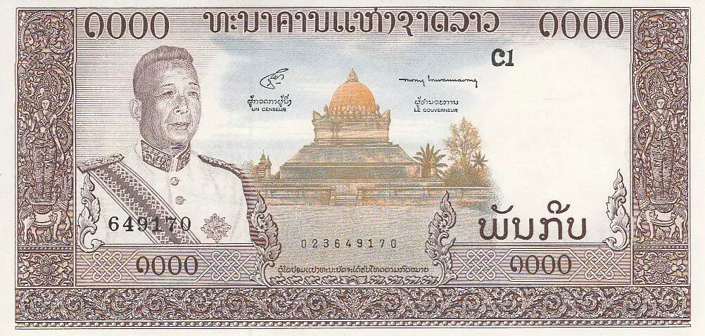 Home > > Lao 1000 Kip, Roi Savang Vatthana, temple - Canoes - 1963 - P.14 b