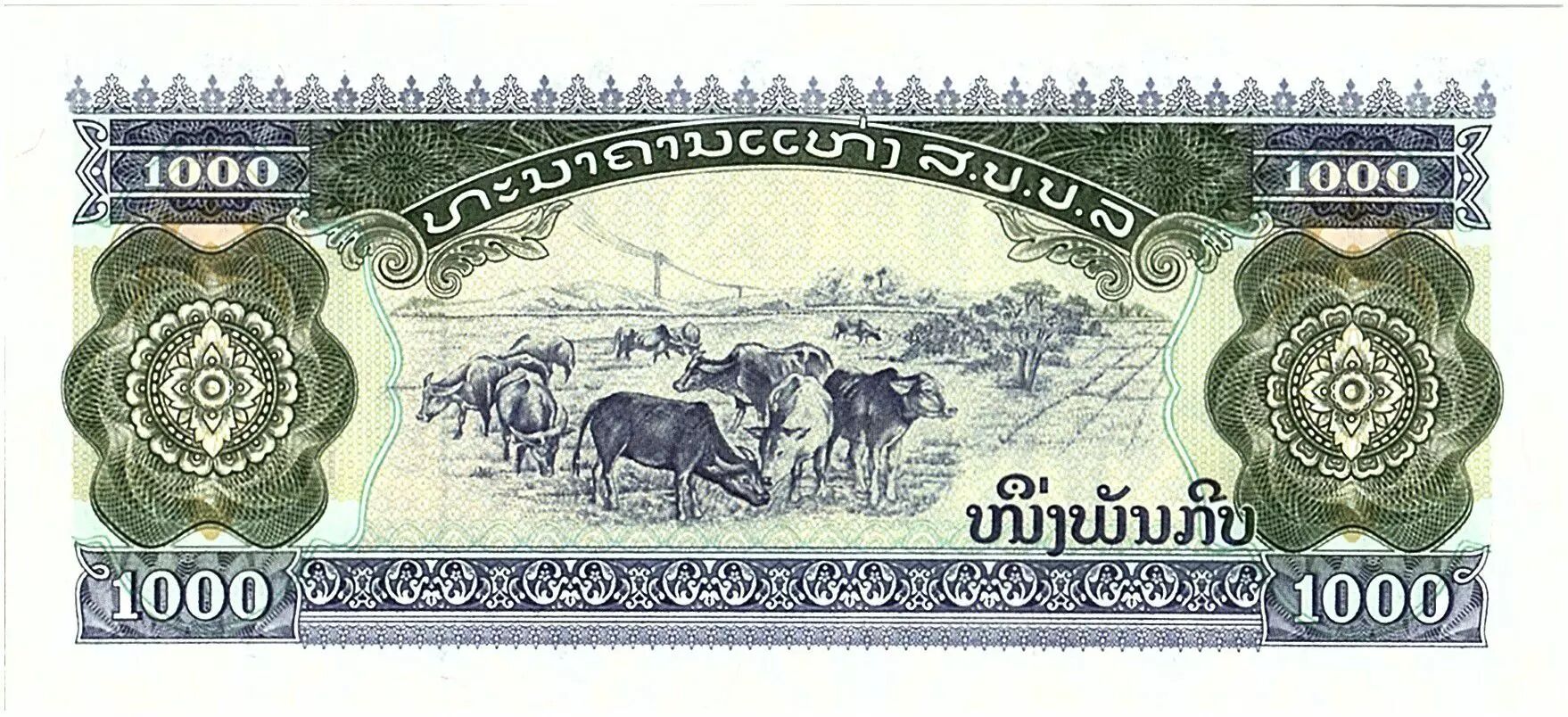 Banknote Lao 1000 Kip, Women, temple - Cows - 1996 - P.32 d