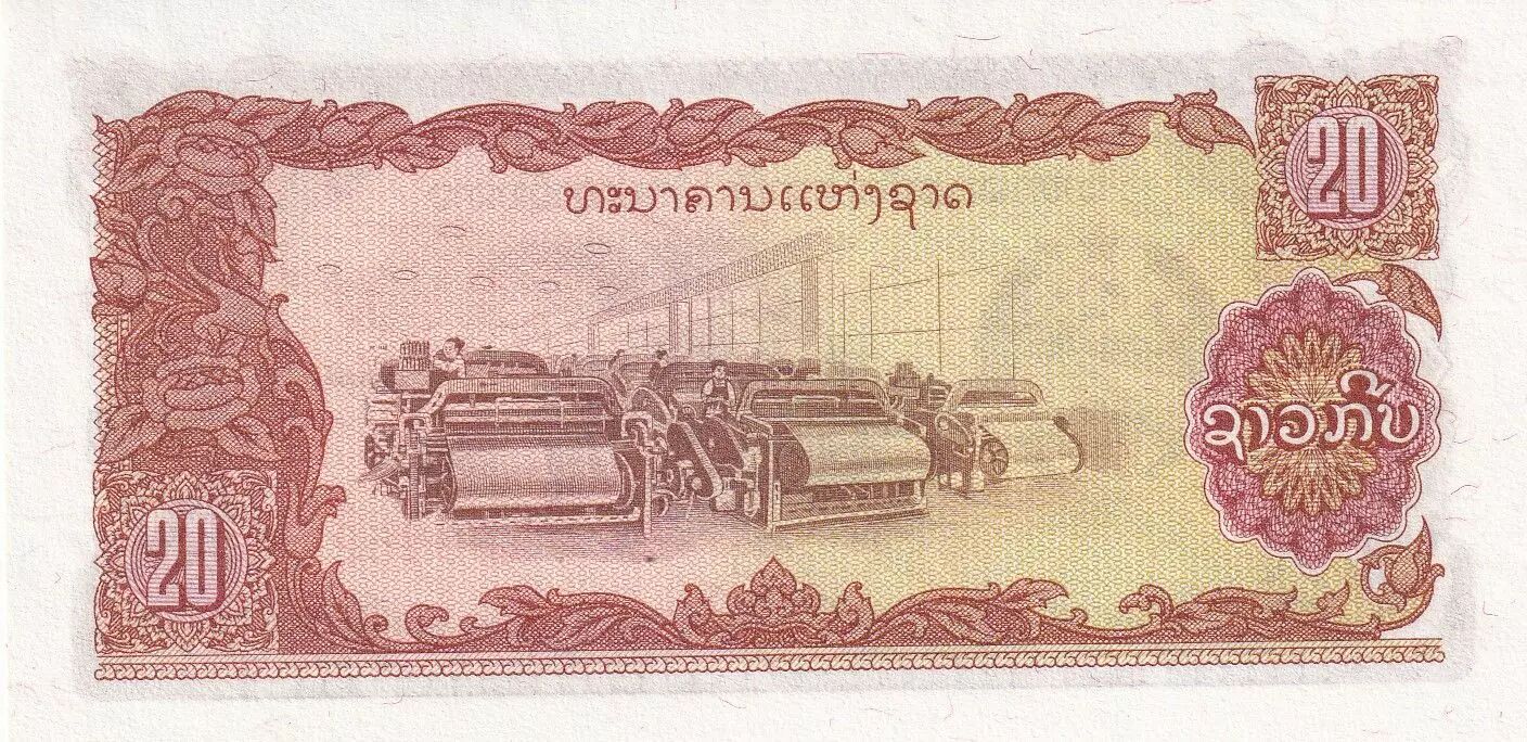 Banknote Lao 20 Kip - Tank with troop - Textil factory - 1979 - Serial EA - P.28