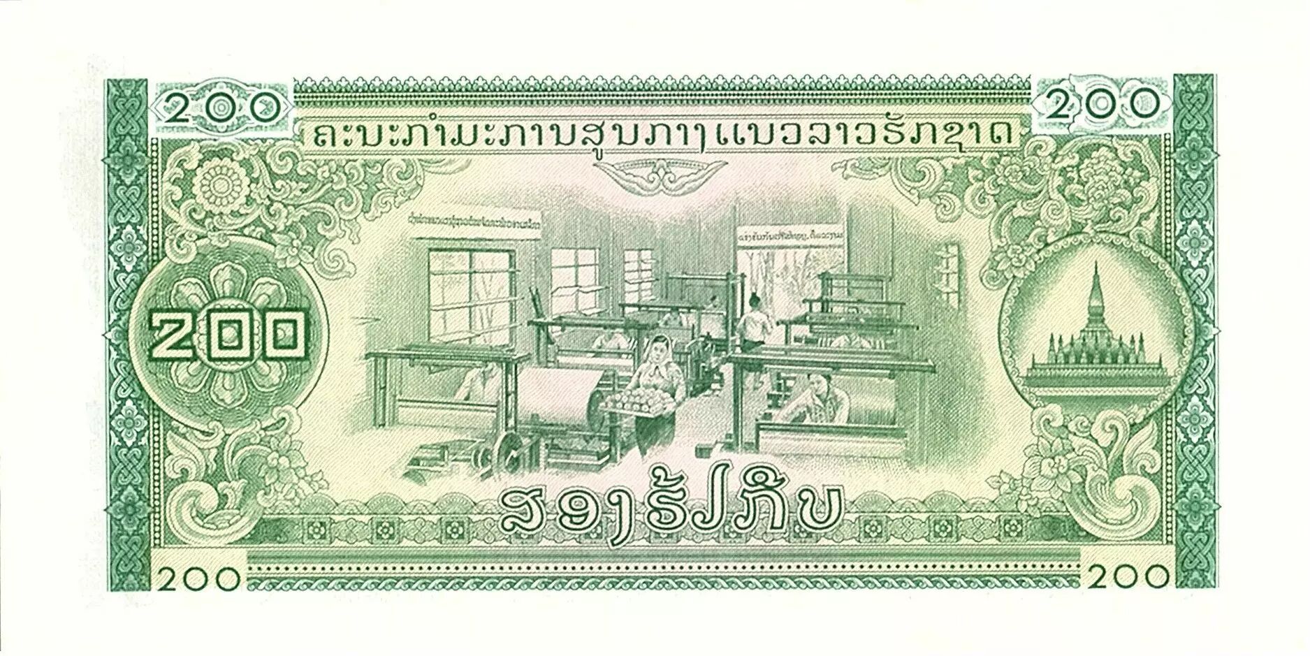 Banknote Lao 200 Kip, Road and trail convoys - Textil factory - 1968 - P.23 A
