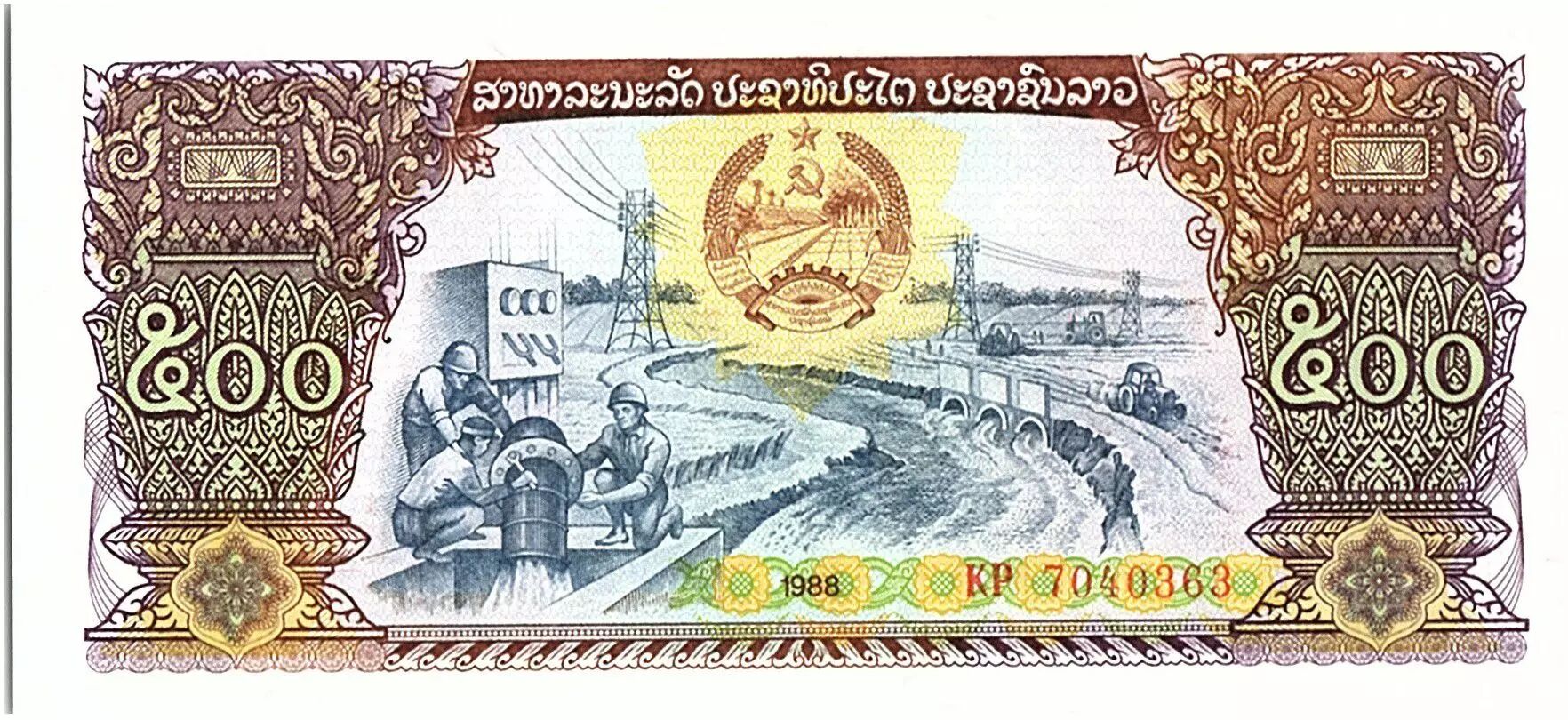 Home > World Banknotes > Asian Banknotes > Laos > Lao 500 Kip, Irrigation system - Harvesting fruit - 1988 - P31 a