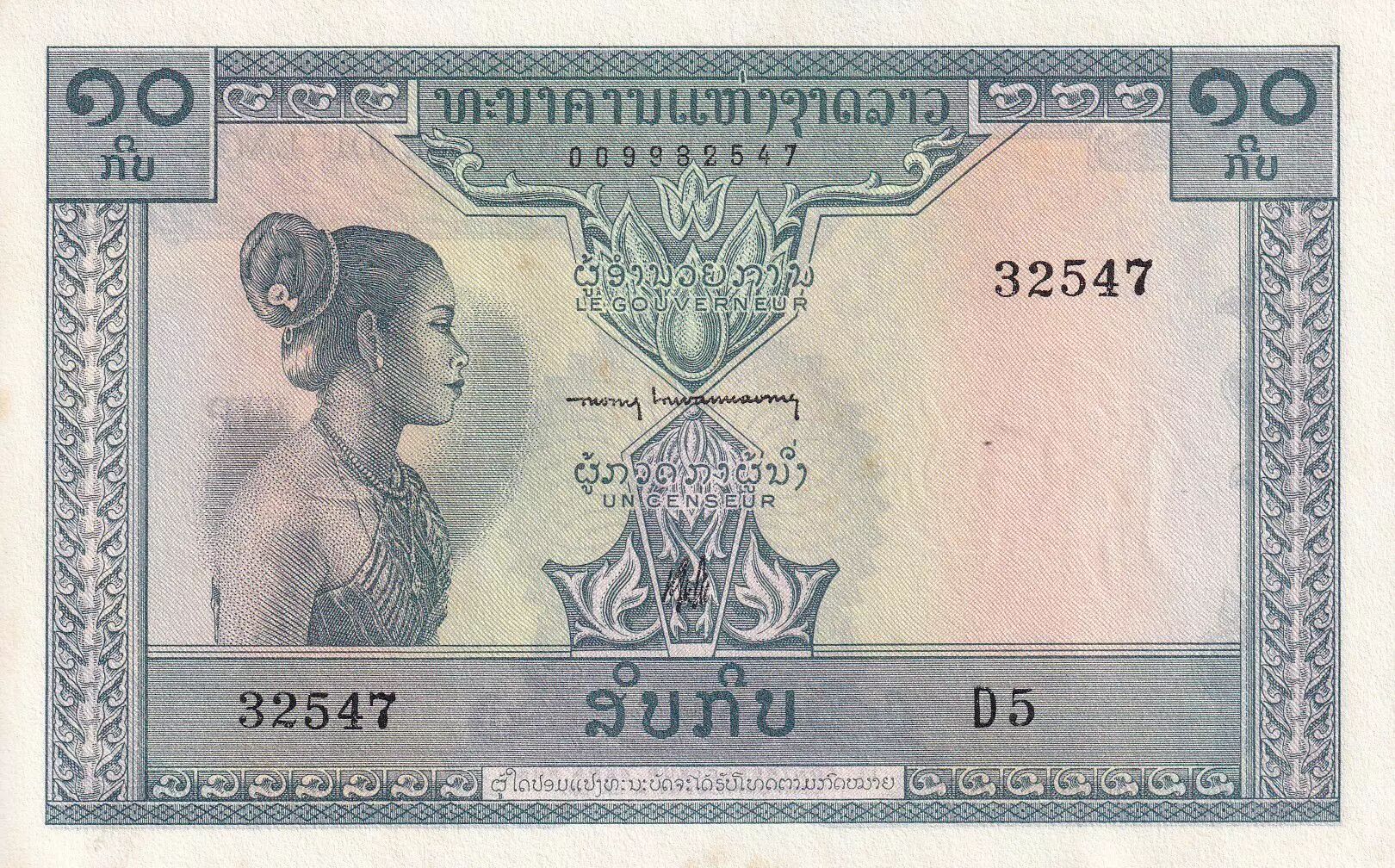 Billet Laos 10 Kip - Laotienne - Figures stylisées - 1962 - Série D.5 - NEUF - P.10b