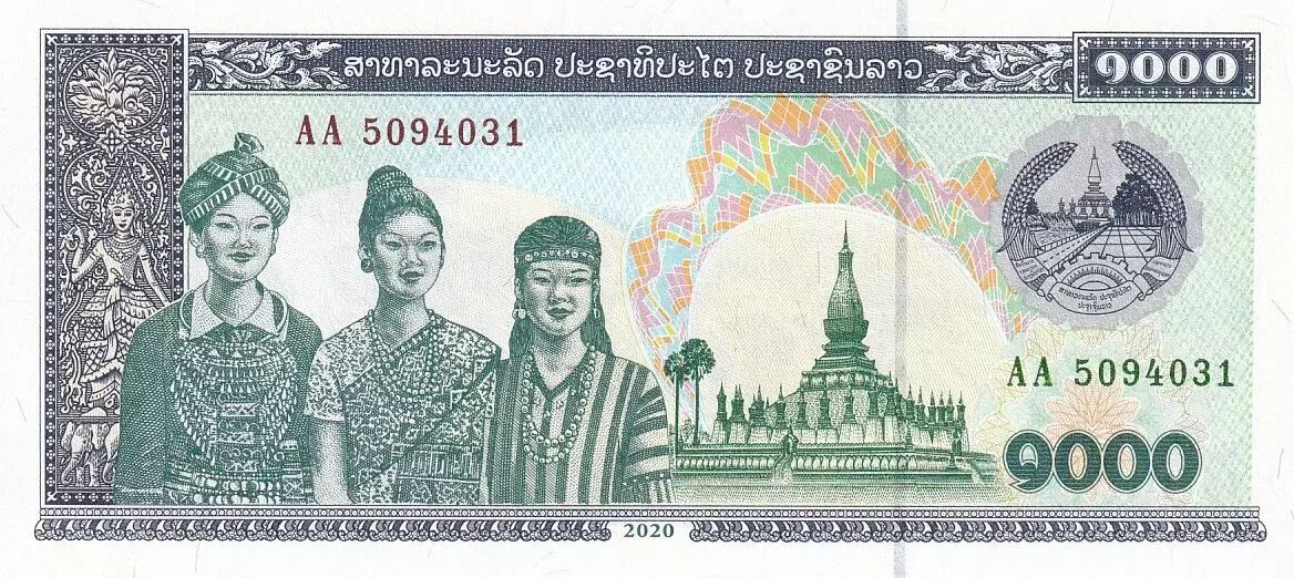 Au recto, le billet arbore des inscriptions en langue lao, élément essentiel de l'identité nationale. La représentation de trois femmes pourrait symboliser la population laotienne ou des figures emblématiques de l'histoire du pays. Le stupa de Wat That Luang à Vientiane, un monument religieux majeur, est également présent, soulignant l'importance du bouddhisme dans la culture laotienne. Le blason national complète la composition du recto, renforçant l'identité du pays. L'ensemble de ces éléments est imprimé dans une calligraphie en écriture laotienne.